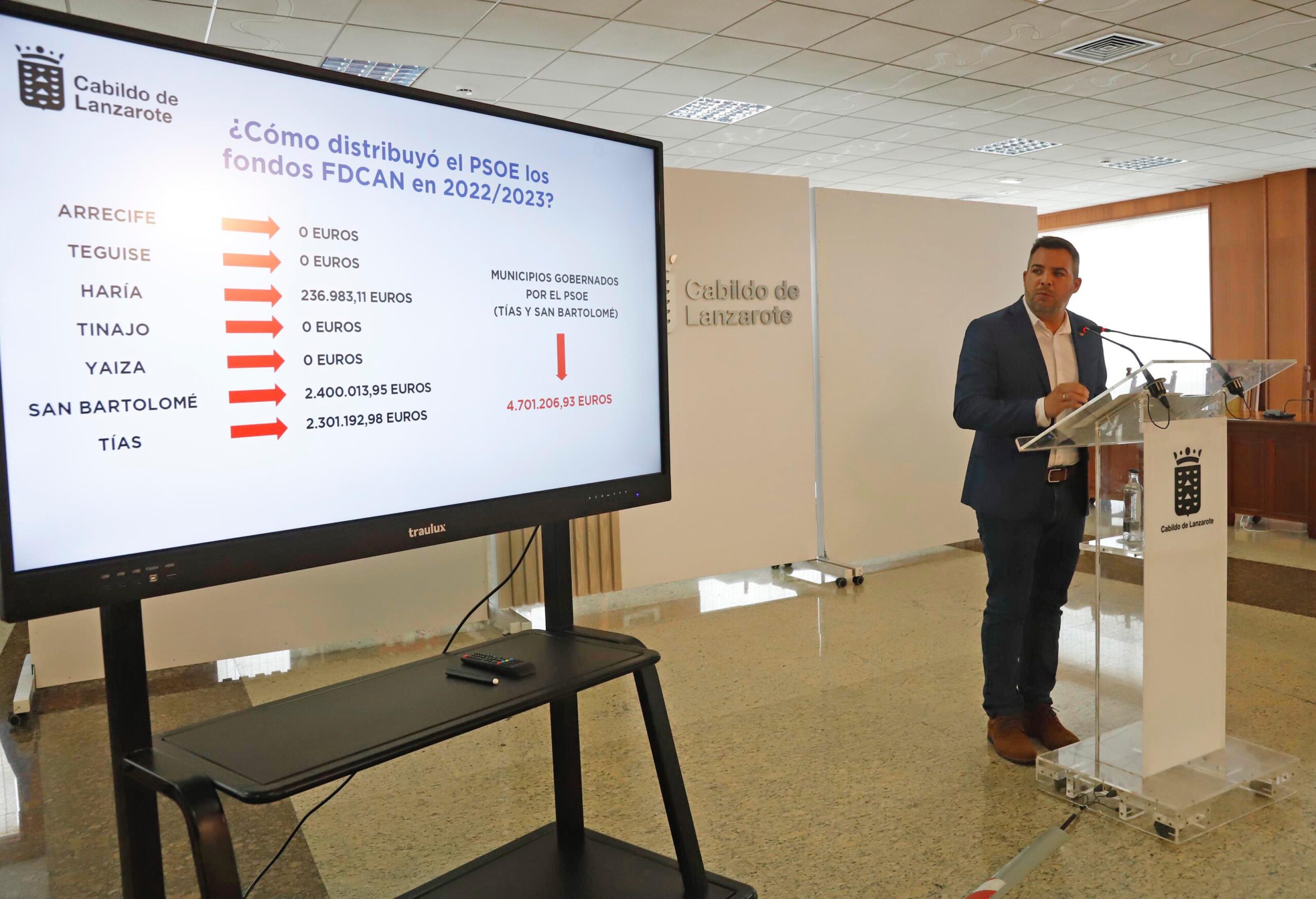 El vicepresidente continuó la rueda de prensa esgrimiendo el método que utilizaba el PSOE cuando ostentó la Unidad de Planificación y Coordinación de Proyectos. “En el año 2022, los municipios de Arrecife, Yaiza, Teguise y Tinajo recibieron 0 euros del FDCAN, mientras que San Bartolomé y Tías recibieron entre los dos casi 5 millones de euros, donde casualmente gobernaba el PSOE”, aseguró Medina.